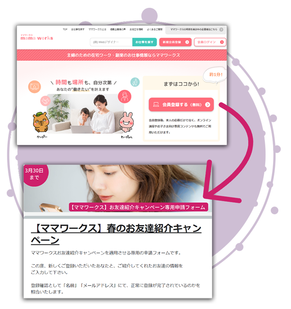 1・シェアいただいたキャンペーンページから「ママワークス」の会員登録フォームにてメールアドレスを入力