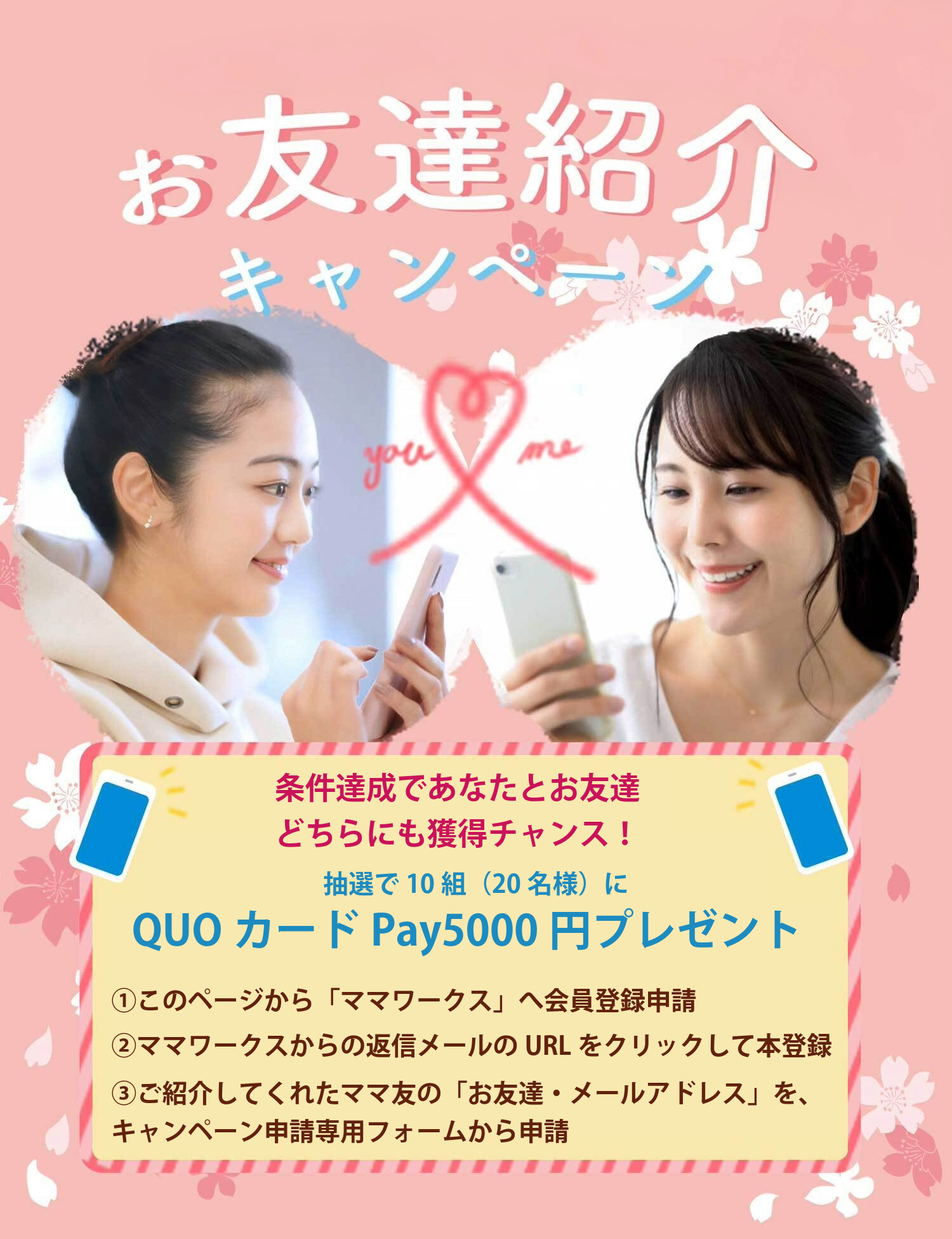 キャンペーン期間内に、本ページをお友達にシェアいただき、お友達が下記の条件を満たした場合、紹介者とお友達に抽選で「5000円分」のQUOカードPayをプレゼントします。
